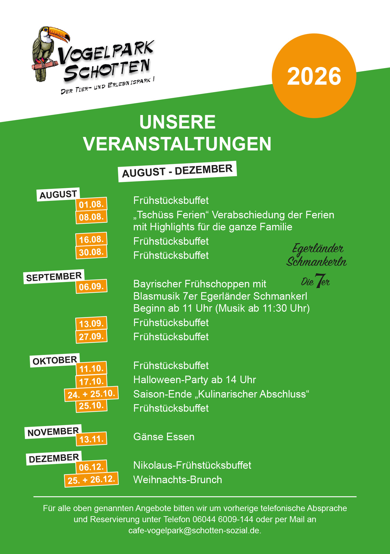 Für alle Frühstücke bitten wir um Reservierung unter Tel. 06044/6009-144 oder unter cafe-vogelpark@schotten-sozial.de
